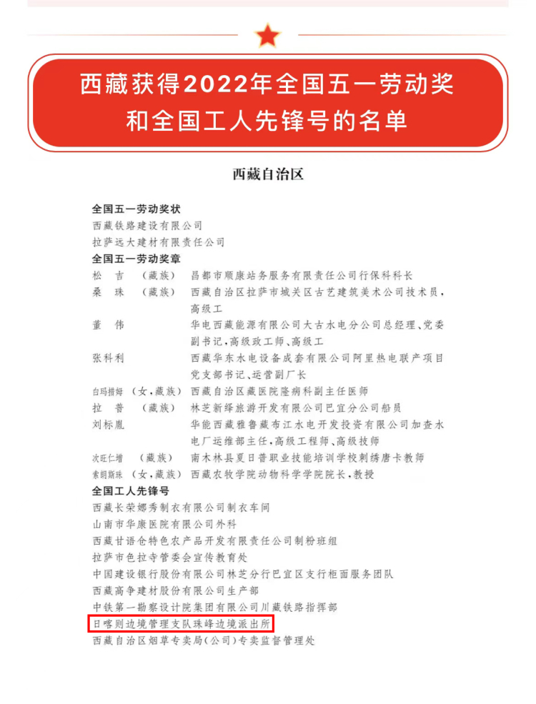 中國西藏網(wǎng)訊 2022年4月28日,中華全國總工會(huì)發(fā)布2022年全國五一勞動(dòng)獎(jiǎng)和全國工人先鋒號(hào)表彰人選(集體)名單,西藏出入境邊防檢查總站日喀則邊境管理支隊(duì)珠峰邊境派出所獲“全國工人先鋒號(hào)”稱號(hào)。