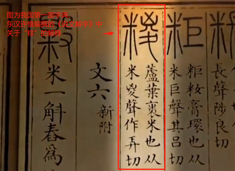 關(guān)于粽子,比較早的文字記載,在距今近2000年前,由東漢學者許慎編纂的我國第一部真正意義上的字典《說文解字》中可以找到——“糉,蘆葉裹米也”。這個記載言簡意賅地說明了制作粽子的原料和方法?!凹F”字就是我們現(xiàn)在使用的“粽”字。