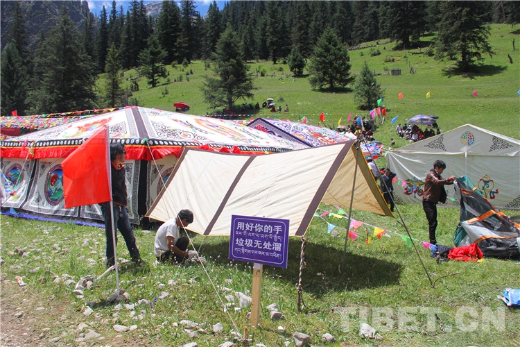 圖為2022年伊日鄉(xiāng)第二屆文化旅游藝術(shù)節(jié)上,前來(lái)參加的群眾在搭建帳篷,旁邊是“用好你的手 垃圾無(wú)處留”的標(biāo)語(yǔ) 攝影:王茜