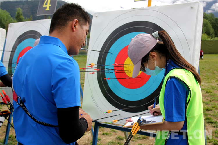 圖為7月29日,一名選手在男子個人70米雙輪賽現(xiàn)場標(biāo)記箭孔 攝影:德吉卓嘎