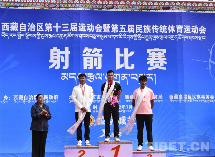 圖為7月29日,男子個人70米雙輪賽頒獎現(xiàn)場,中間為冠軍選手林芝市代表團(tuán)運動員嘎瑪江村,其右為亞軍選手拉薩市代表團(tuán)運動員瓊達(dá)次仁,其左為季軍選手教育代表團(tuán)運動員旦增羅布 攝影:拉姆
