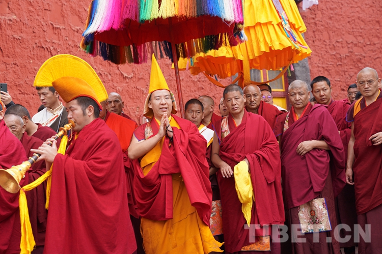 班禪抵達(dá),現(xiàn)場桑煙繚繞,法號聲悠長,扎什倫布寺僧眾以藏傳佛教最高禮儀迎接班禪。現(xiàn)場等候班禪的信教群眾紛紛摘帽行禮或雙手合十,向班禪的到來表示熱烈歡迎,班禪見狀揮手致意、送上祝福。隨后,班禪在手持黃傘、香爐的高僧引領(lǐng)下緩緩步行至措欽大殿。