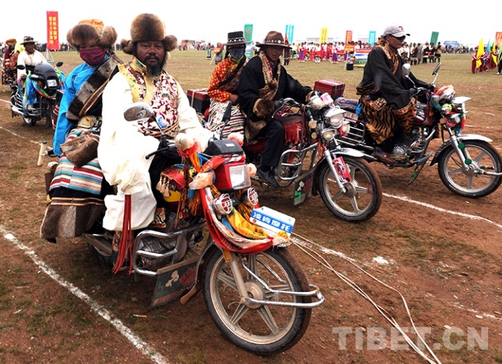 這是在雙湖縣慶祝建縣儀式上,著盛裝的牧民摩托車車隊正在通過主席臺(唐召明2013年7月26日攝)