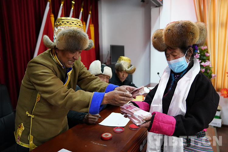 “普布達(dá)桑44565元、多吉扎西38750元、加央卓瑪2000元……”被叫到名字的村民和放牧員們紛紛上前領(lǐng)取入股后的第一次分紅。當(dāng)天牧場(chǎng)為12名放牧員和入股的102戶村民共發(fā)放了64.65萬元的薪資和分紅款。