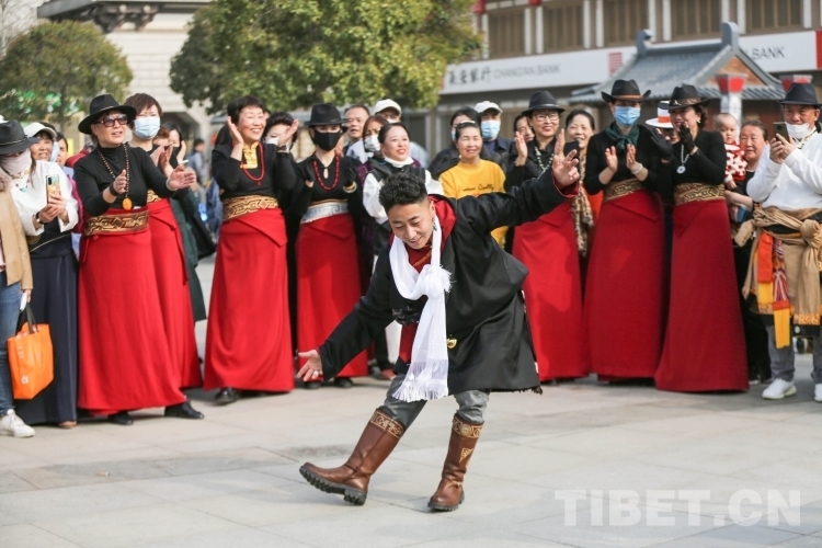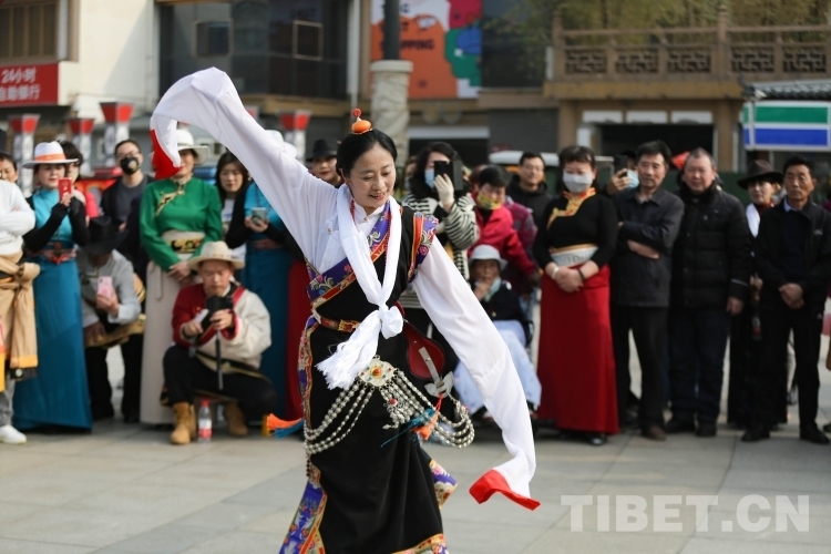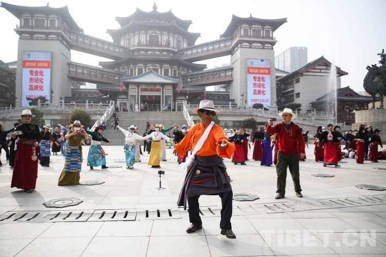 中國西藏網訊 3月21日,由新的社會階層人士服務團三分團主辦、北京藏地神韻非物質文化傳播發(fā)展公司承辦的傳統(tǒng)藏舞公益推廣活動在西安舉辦。多位藏舞傳承人與藏舞愛好者齊聚西安大唐西市進行公益推廣交流。鍋莊、伊舞,《歡迎你們到來》《舞動青春年華》《吉祥的哈達》……一曲接著一曲,舞出了藏族舞蹈的無限魅力!(中國西藏網 記者/呂靜 姚浩然)