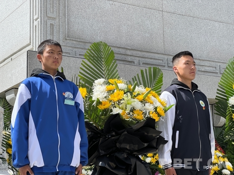 圖為拉薩那曲第一高級中學(xué)學(xué)生代表向革命先烈敬獻(xiàn)花籃 攝影:德吉卓瑪