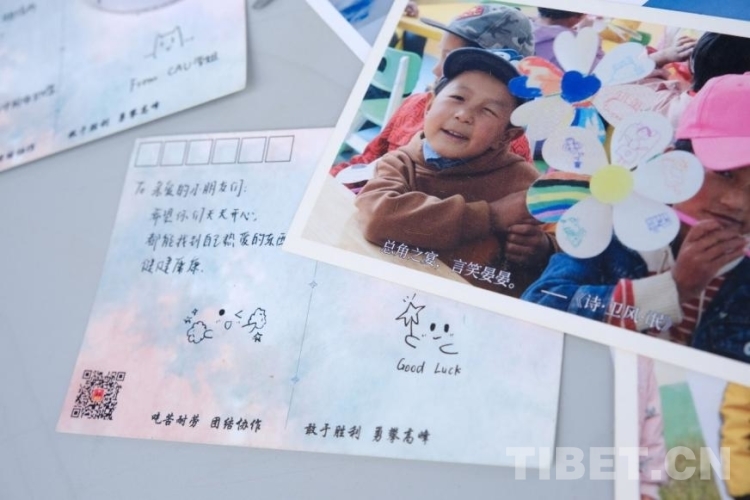 參與活動的同學們在峰云社人文科考隊準備的明信片上寫下對當?shù)匦∨笥衙篮玫淖8!R粡垙垖懼鴿M滿關切話語、畫著生動可愛圖案的明信片上,飽含著中國農(nóng)業(yè)大學師生對雪域高原孩子們滿滿的愛意。