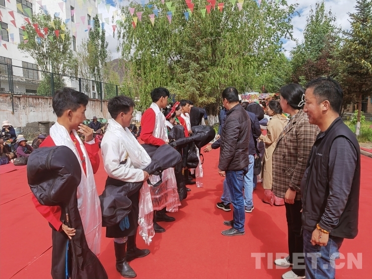 圖為學(xué)校為唐卡專業(yè)的學(xué)生贈(zèng)送自己的唐卡作品和繪畫工具及顏料等