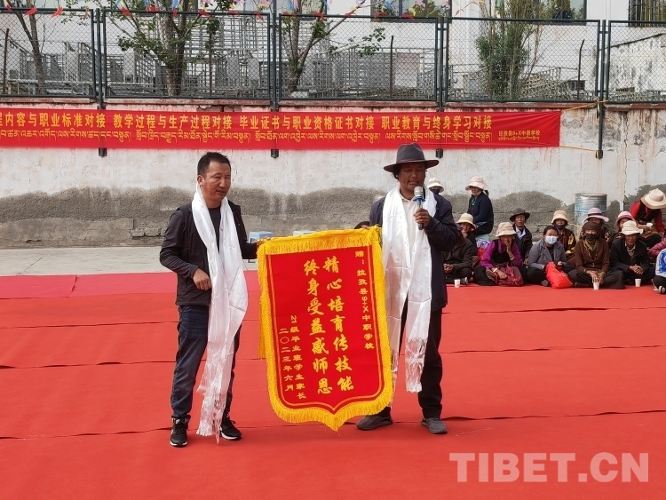 活動(dòng)現(xiàn)場(chǎng),學(xué)生家長(zhǎng)代表向?qū)W校贈(zèng)送錦旗并發(fā)表感言?!案兄x拉孜縣9+X中職學(xué)校培養(yǎng)了我的孩子,經(jīng)過學(xué)校的精心培養(yǎng),讓家人操碎心的孩子如今依靠從學(xué)校學(xué)到的技藝找到了一份滿意的工作,這讓我一家人感到很欣慰。”學(xué)生家長(zhǎng)代表白瑪有感而發(fā),“希望在場(chǎng)的孩子們也通過發(fā)揮自己的優(yōu)勢(shì),在社會(huì)上找到一份心儀的工作,同時(shí)真心祝福學(xué)校越辦越好。”