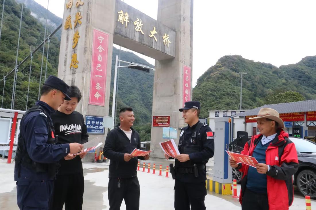 圖為背崩邊境派出所解放大橋執(zhí)勤點(diǎn)民警為過往群眾講解邊境條例相關(guān)知識 攝影:呂恒剛
