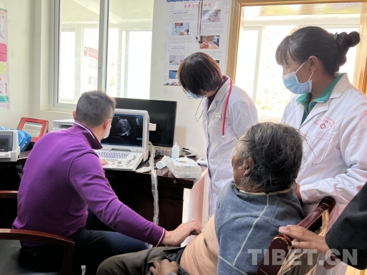 “彩超呢?”北京上地醫(yī)院院長張宇在衛(wèi)生院工作人員的帶領(lǐng)下來到衛(wèi)生院二樓為75歲的桑旦江措老人進(jìn)行胸部彩超檢查,“霍主任(中國中醫(yī)科學(xué)院望京醫(yī)院心內(nèi)科主任)懷疑他有心衰,患者不能平臥睡覺、走路氣喘、雙腿腫脹,所以我想通過超聲印證一下,昨天我們也篩查了一些有心衰跡象的群眾,平時(shí)大家覺得氣喘是小問題,忍忍就好了,實(shí)際上它還是很嚴(yán)重的,要及時(shí)治療?!睆堘t(yī)生告訴記者,“藏族群眾對(duì)骨科和胃腸道的關(guān)注度更高,但是心臟、血管、糖尿病等不會(huì)立馬表現(xiàn)出來的慢性病不太重視,這樣往往會(huì)錯(cuò)過最佳的治療時(shí)間。所以我們應(yīng)該通過講座和培訓(xùn),一方面要增強(qiáng)群眾的健康意識(shí),另一方面也要培養(yǎng)當(dāng)?shù)赜玫蒙稀⒘舻米〉募夹g(shù)型人才。”
