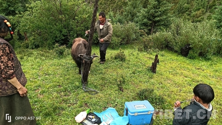 只見那頭受傷的牛被拴在木樁上,尾巴處還帶有一些血跡,顯得非常虛弱。索杰醫(yī)生先是把手術(shù)的傷口處仔細(xì)檢查了一遍,然后取來藥箱,在傷口處給藥,他告訴牧民家的男主人,?;謴?fù)得還可以,不要太擔(dān)心,留下的藥是這幾天涂抹和口服的,要按時(shí)服用。