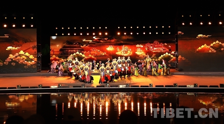 當晚開幕式文藝演出共分為序《雪頓新韻》、上篇《相約雪頓》、下篇《心約拉薩》和尾聲《百年雪頓》四部分,整場文藝演出融合歌曲、舞蹈、藏戲、京劇、昆曲、街舞等元素,并以半實景的舞臺藝術(shù)形式上演《百年雪頓》等節(jié)目,線上線下呈現(xiàn)了一臺傳統(tǒng)與現(xiàn)代交相輝映、傳承與創(chuàng)新和諧相融、歷史與未來一脈相承的文藝盛宴。