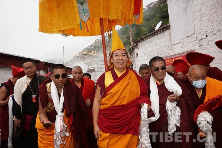 當(dāng)日11時(shí)許,在眾僧的期盼中,班禪一行抵達(dá)直孔替寺。頓時(shí),現(xiàn)場(chǎng)法號(hào)齊鳴、法螺合奏,直孔瓊倉(cāng)·洛桑強(qiáng)巴活佛和僧眾在寺廟前舉行了隆重的歡迎儀式。
