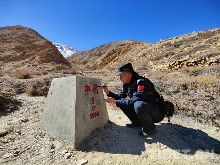 巡邏結束回到執(zhí)勤點后,邊巴次仁并沒有卸下執(zhí)勤裝備,而是拿著毛筆和紅油漆朝著執(zhí)勤點的河對岸走去,過河幾百米便是中尼5號界樁?!爸挥袌允卦谶吘车奈覀儾拍荏w驗到,除夕這天,為界碑描紅的自豪感?!彼贸雒P跟紅漆一筆一劃地描著界碑上的每一個字?!懊杓t界碑那一刻,眼前是界碑,身后是祖國,我們守的是萬家燈火?!边叞痛稳恃凵駡远ǖ乜粗砬暗慕绫f。