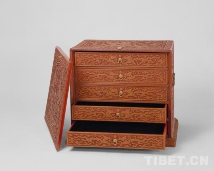 箱子兩側(cè)及蓋面紋飾與插門相同,僅龍紋為單龍戲珠。箱背面為綠色海水,上雕松鶴圖,鶴有六只,寓意“六合同春”“松鶴延年”。箱內(nèi)裝抽屜五具,無(wú)遮擋,寬寬敞敞,屜面雕云龍戲珠紋。底座雕纏枝小朵花卉紋。(中國(guó)西藏網(wǎng) 綜合/周晶)