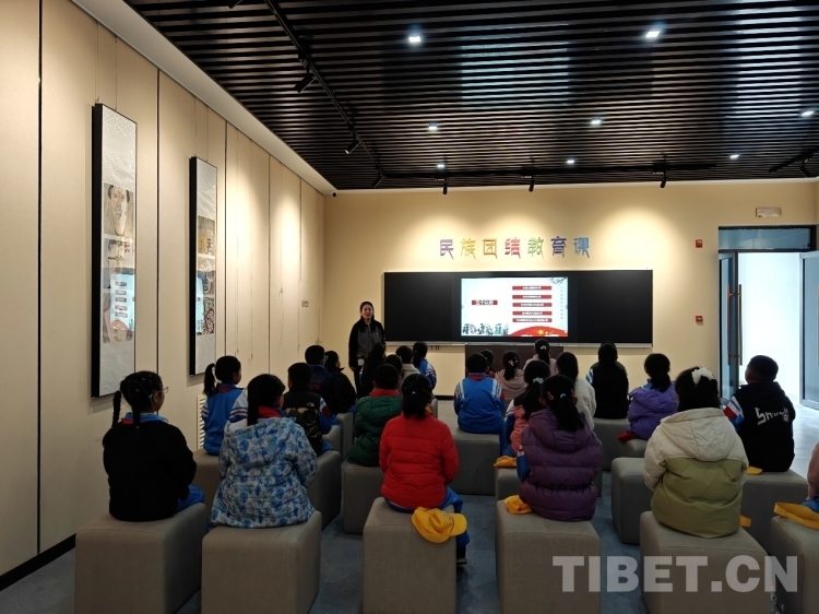 圖為開館儀式當(dāng)天,當(dāng)?shù)貙W(xué)生在展館內(nèi)上民族團(tuán)結(jié)教育課