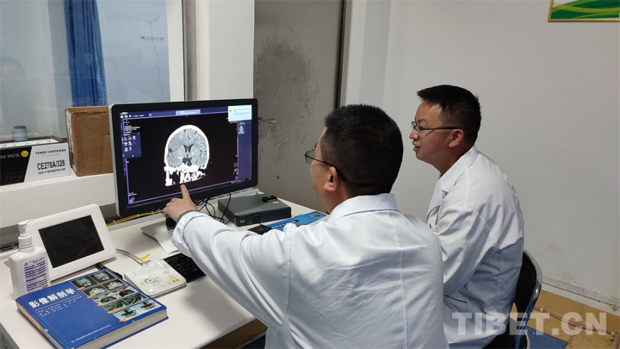 圖為醫(yī)療隊(duì)隊(duì)員對(duì)腦梗患者的顱腦CT進(jìn)行閱片