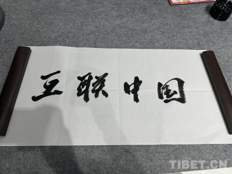 圖為BrainCo強(qiáng)腦科技產(chǎn)品體驗(yàn)官倪敏成用毛筆字寫(xiě)的“互聯(lián)中國(guó)”四字