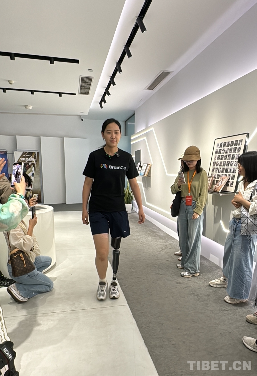 圖為BrainCo強(qiáng)腦科技產(chǎn)品體驗(yàn)官高瑞霞在自信地走路