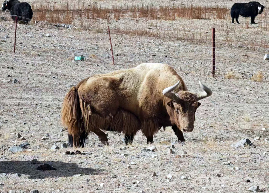 圖為羌塘國(guó)家級(jí)自然保護(hù)區(qū)的一頭金絲野牦牛與放牧的家畜牦牛和諧相處(革吉縣野保員洛洛提供)