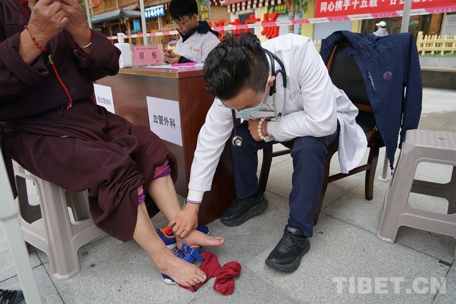 得知有來自北京的醫(yī)療專家為大家義診,家住白玉縣城的切呷一大早便帶著父母來到了義診現(xiàn)場。她的母親澤仁拉嘎今年75歲,自述下肢從腰間、腿部到腳尖都會(huì)發(fā)麻、有疼痛感,行走時(shí)腰部會(huì)很累,偶爾還會(huì)因?yàn)榭刂撇缓猛炔炕顒?dòng)而摔倒。北京水利醫(yī)院創(chuàng)傷骨科副主任醫(yī)師王耀輝在經(jīng)過詳細(xì)問診后,為拉嘎阿媽開具了營養(yǎng)神經(jīng)的藥品,并建議她進(jìn)一步做胸椎和腰椎方面的檢查。