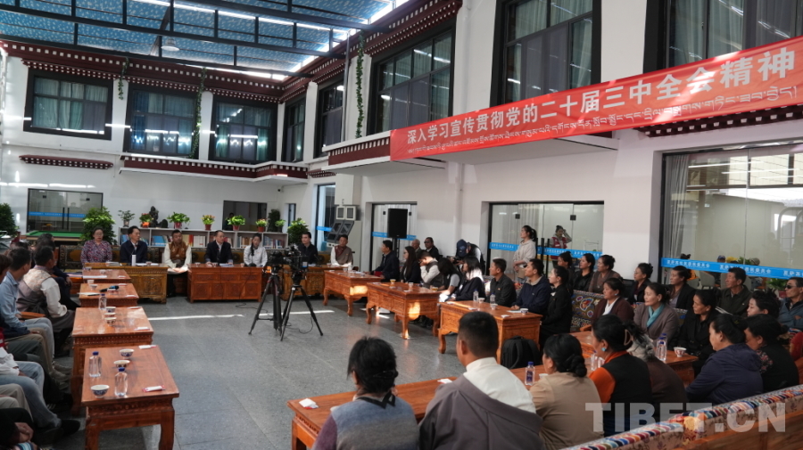圖為夏薩蘇社區(qū)干部群眾共同學(xué)習(xí)黨的二十屆三中全會精神,分享交流學(xué)習(xí)體會。攝影:德吉卓瑪