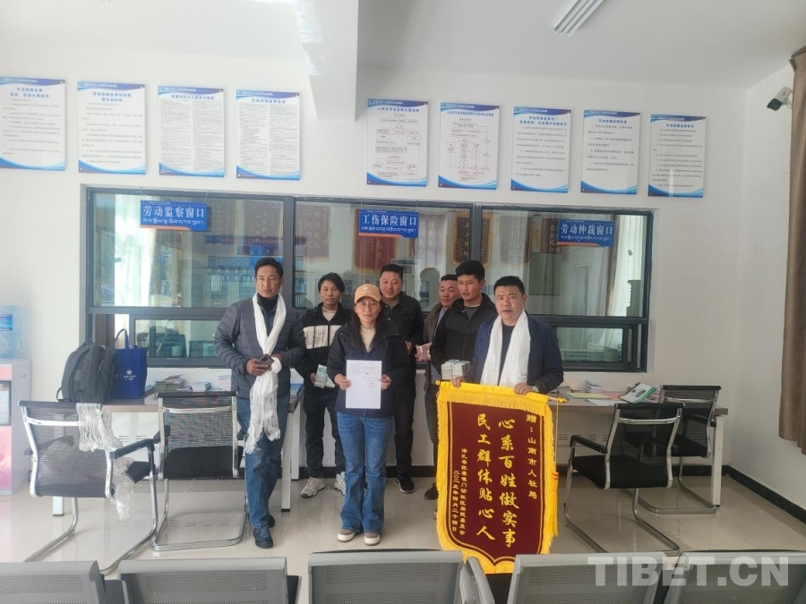圖為山南市人社局為農(nóng)民工追回血汗錢,獲贈(zèng)群眾錦旗