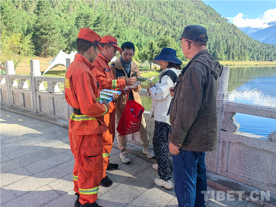 圖為波密縣森林消防員向游客講解森林防火常識