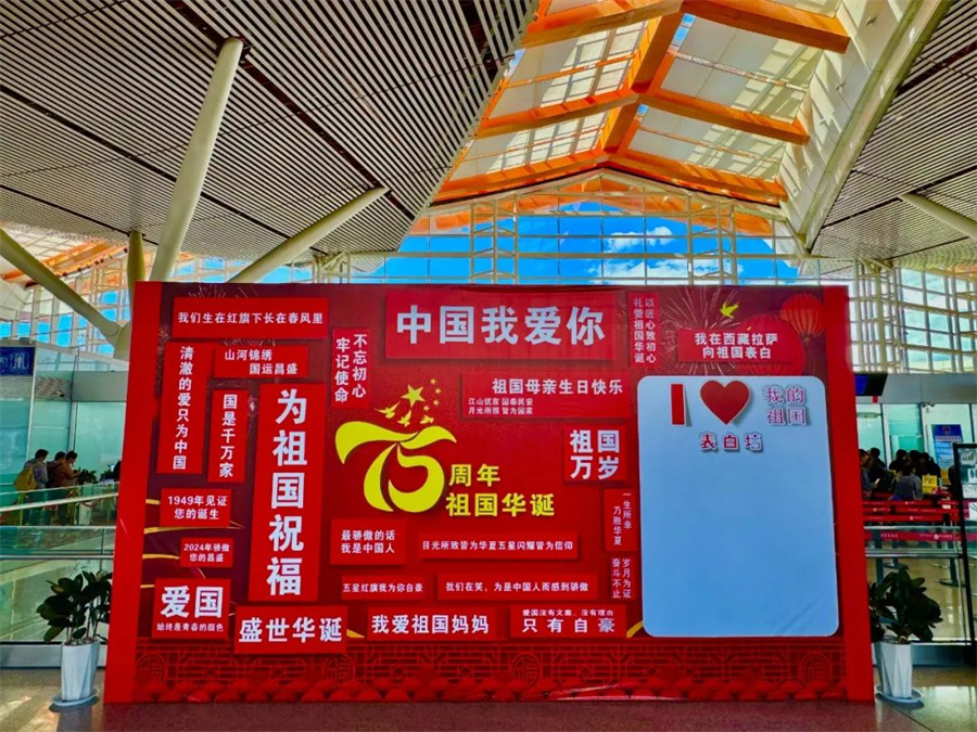 圖為拉薩貢嘎國際機(jī)場T3航站樓內(nèi)設(shè)置的愛國表白墻