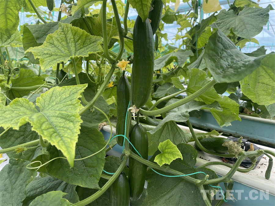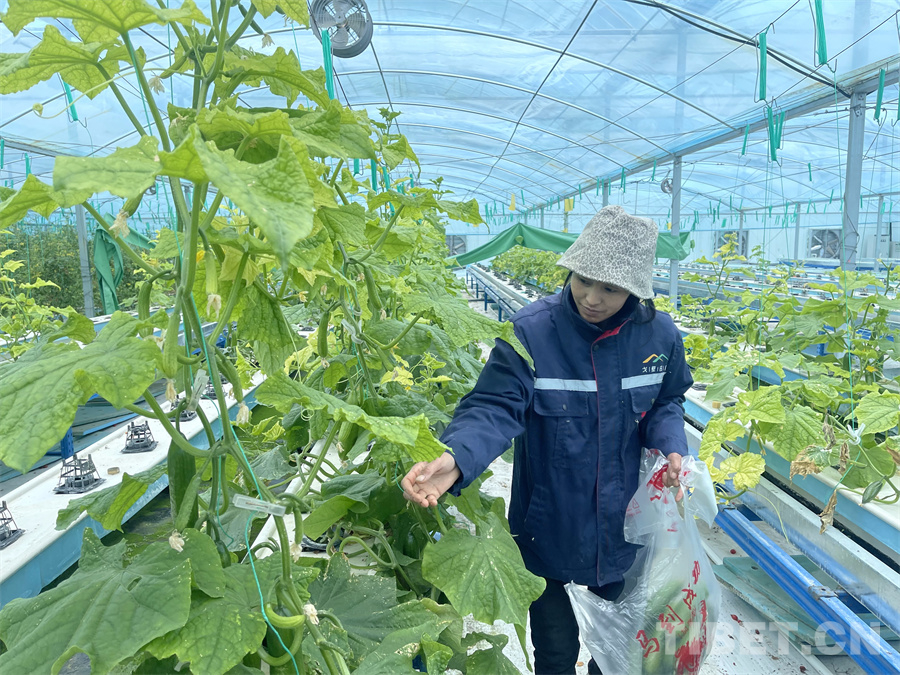 圖為八宿縣白瑪鎮(zhèn)產業(yè)園區(qū)內,工作人員正在采摘無土栽培出的成熟黃瓜 攝影:王妍丹