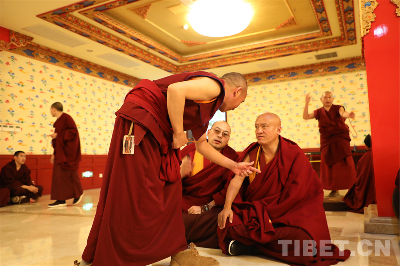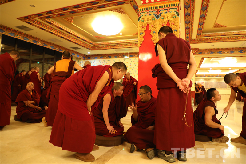 下午,師生們旁聽了中國特色社會(huì)主義理論和憲法與法律基礎(chǔ)等課程。晚上,開展了精彩非凡的辯經(jīng)活動(dòng)。學(xué)員們各自組團(tuán)尋找“對(duì)手”,大廳里激烈的辯論聲、擊掌聲此起彼伏,場面熱烈,氣勢(shì)逼人。辯經(jīng)是藏傳佛教中一種獨(dú)特的學(xué)習(xí)方式,通過對(duì)辯雙方邏輯清晰、言之有據(jù)的反復(fù)辯論,加深學(xué)習(xí)理解。