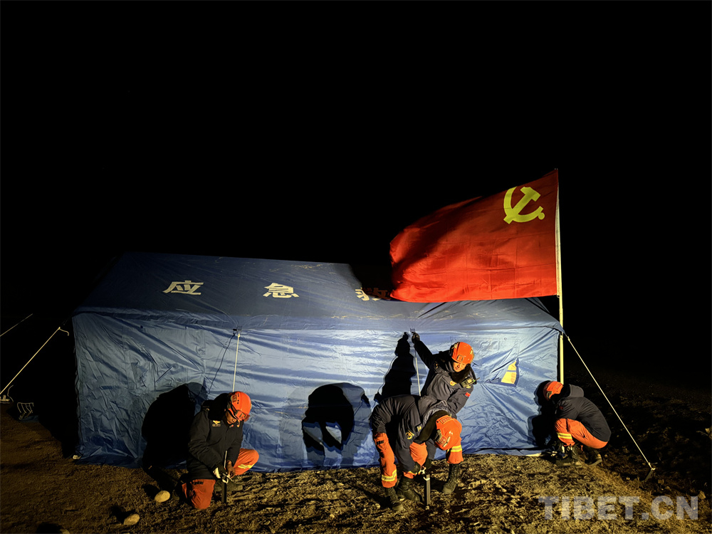 圖為1月7日晚,救援人員搭建應(yīng)急救援帳篷