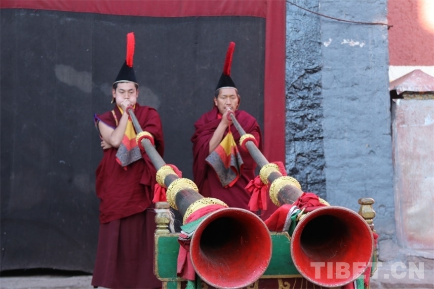 圖為迎請護法神像之前,薩迦寺院內(nèi)的儀式 攝影:王妍丹