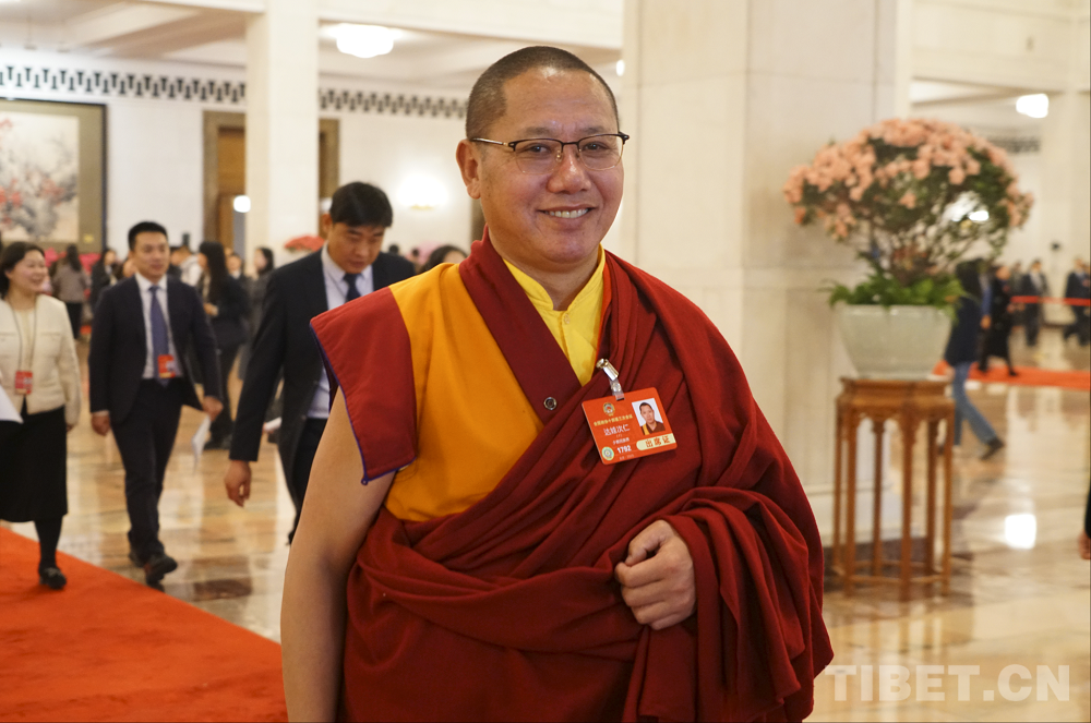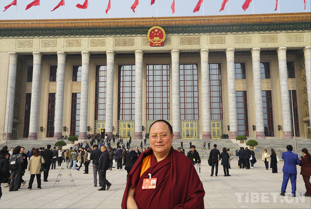圖為全國(guó)政協(xié)委員達(dá)扎·尕讓托布旦拉西降措在人民大會(huì)堂前 攝影:楊眉笑