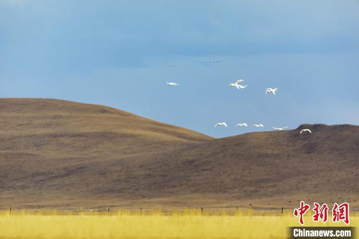 大天鵝翱翔在藍天?!∪魻柹w縣融媒體中心供圖 攝