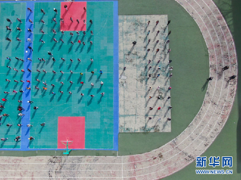 在青海省玉樹藏族自治州八一孤兒學(xué)校,學(xué)生們?cè)谶M(jìn)行課間活動(dòng)(4月3日攝,無人機(jī)照片)。新華社記者 張龍 攝