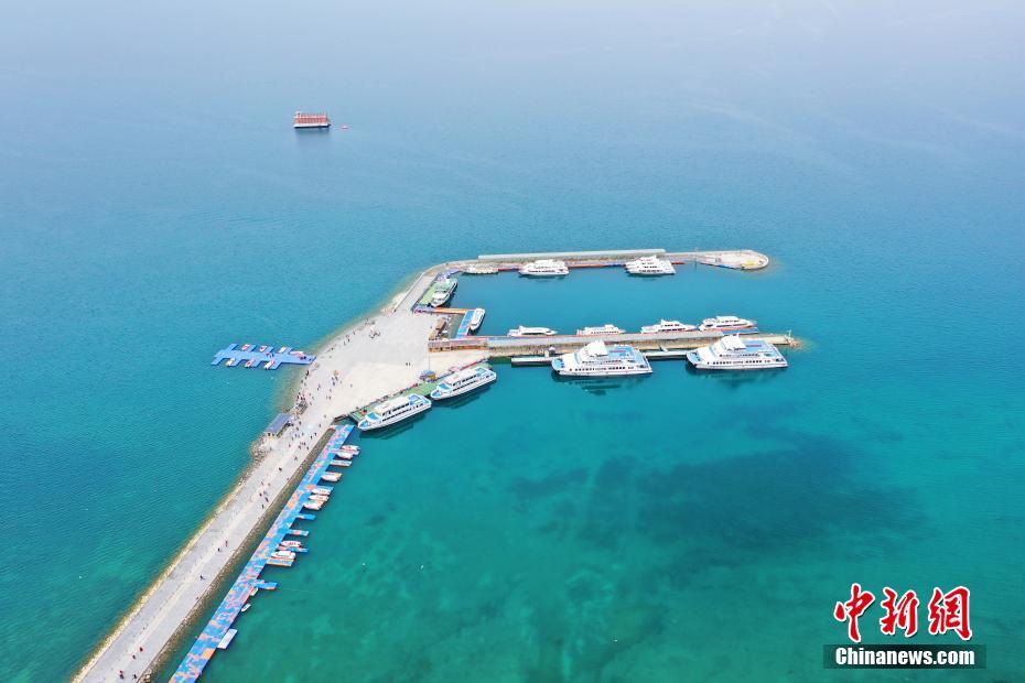 5月19日,航拍被碧綠湖水包圍的青海湖二郎劍景區(qū)碼頭。初夏時節(jié),青海省海南藏族自治州青海湖畔萬物復(fù)蘇,碧水藍(lán)天,宛如油畫。中新社記者 馬銘言 攝