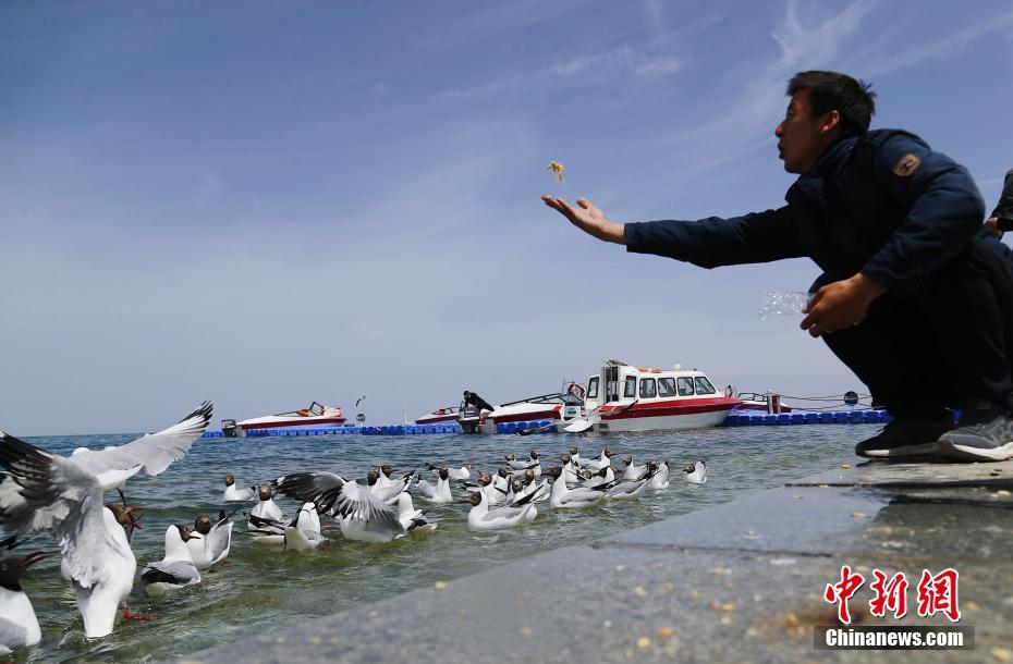 5月19日,一位游客在青海湖二郎劍景區(qū)內(nèi)給水鳥喂食。當(dāng)日是中國旅游日,游客在青海省海南藏族自治州青海湖二郎劍景區(qū)內(nèi)乘船觀湖、與水鳥互動、感受初夏青海湖的海天一色之美。中新社記者 馬銘言 攝