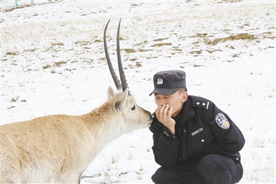 站在離它們不遠(yuǎn)的地方,相互平靜地對(duì)視,許久,一只小藏羚羊才走上前來,把臉慢慢靠近蹲在地上的才仁多杰的面頰。