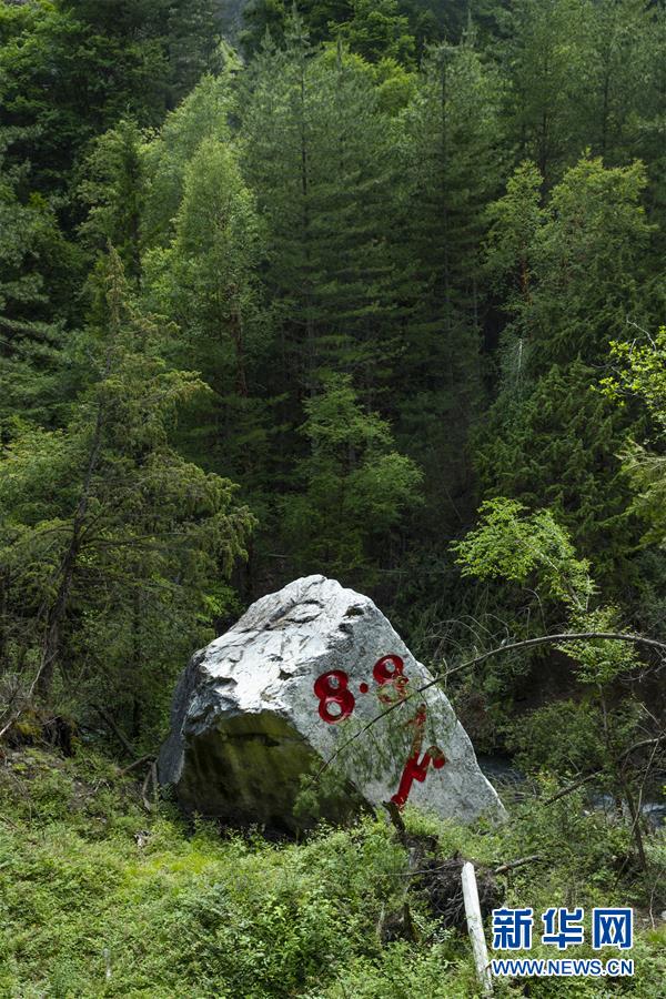 這是九寨溝風景名勝區(qū)內的“8·8石”(6月18日攝)。地震中,這塊高約9.2米、重約522噸的巨石從海拔2654米的山體滾落至河谷,垂直落差達272米。此石為白云質灰?guī)r,形成于3.2億年前的海洋環(huán)境,見證了九寨溝的滄桑變遷。新華社記者 沈伯韓 攝