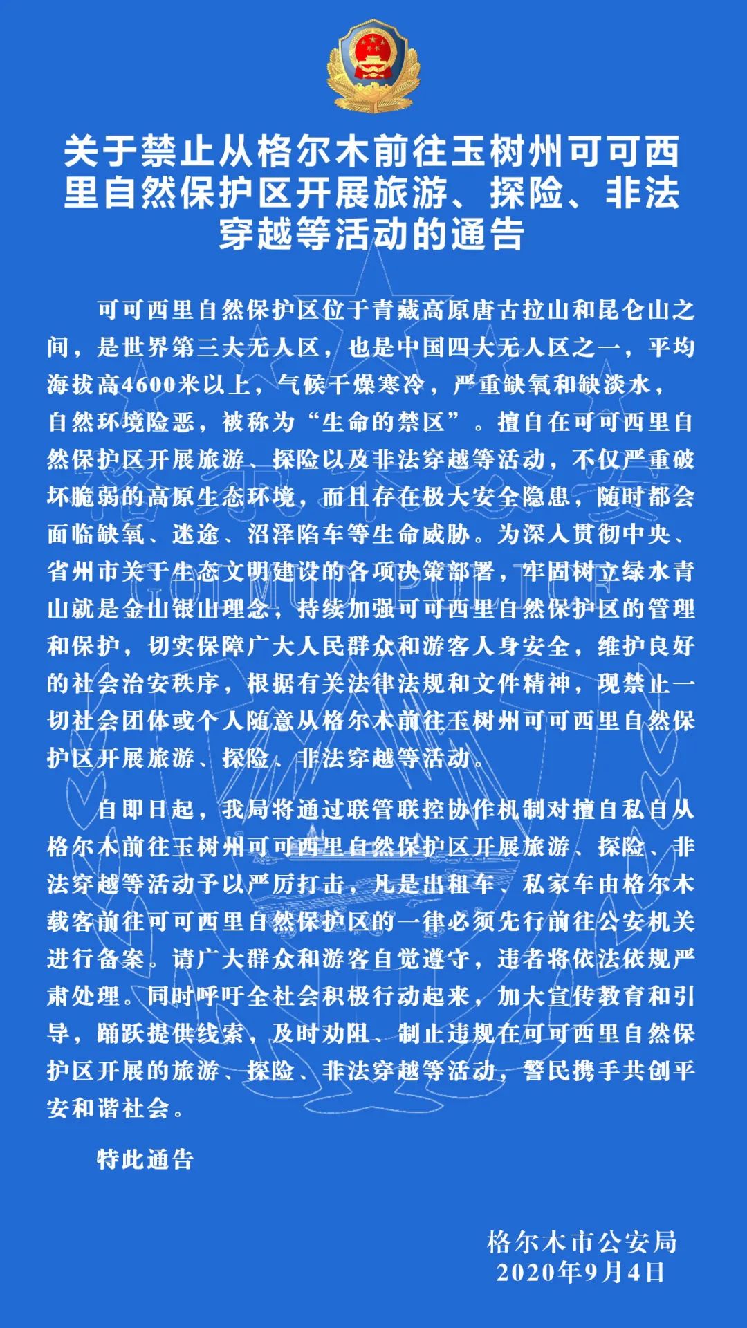 據(jù)格爾木公安微信公眾號消息,9月4日,青海省格爾木市公安局發(fā)布通告,禁止一切社會團體或個人隨意從格爾木前往玉樹州可可西里自然保護區(qū)開展旅游、探險、非法穿越等活動,即日起將對上述行為予以嚴厲打擊,凡是出租車、私家車由格爾木載客前往可可西里自然保護區(qū)的一律必須先行前往公安機關(guān)進行備案。