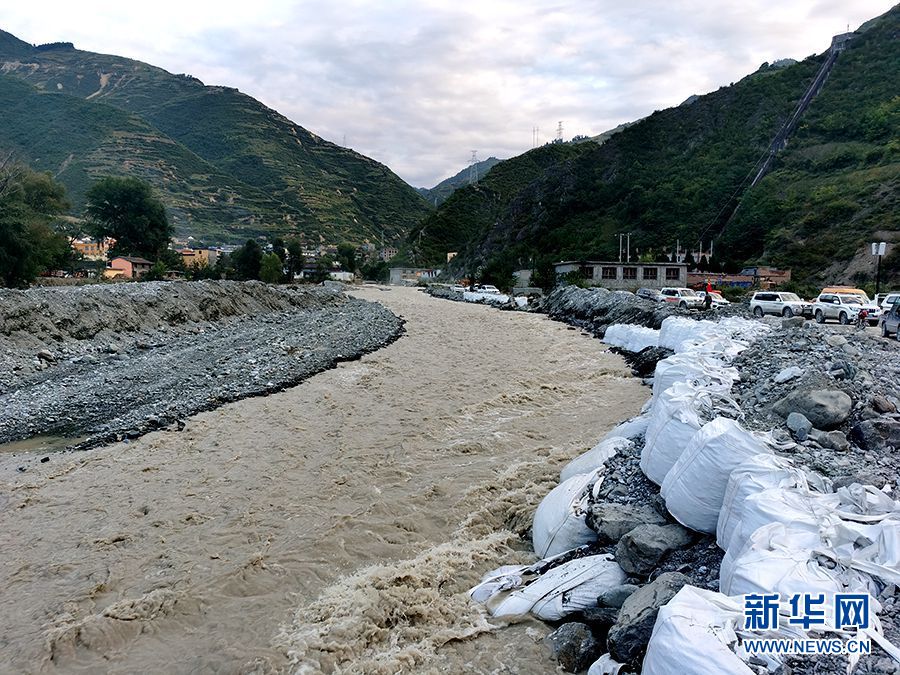 這是舟曲縣曲告納鎮(zhèn)一處用沙袋修筑的河堤。新華網(wǎng)發(fā)(張靜 攝)