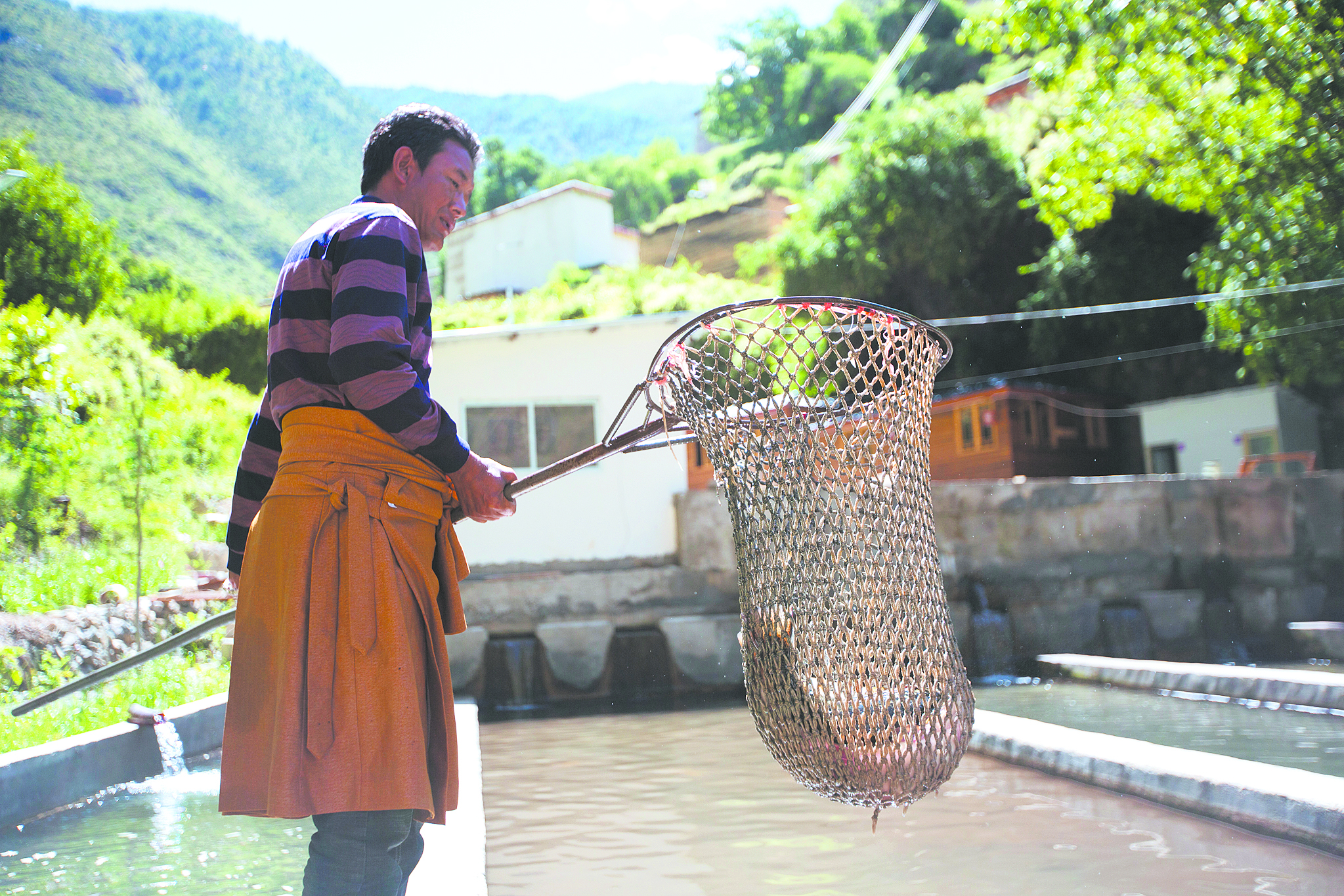在成品魚池前,38歲的藏族老鄉(xiāng)彭錯正拿著網(wǎng)兜撈魚。今天有買家來看魚,他負責(zé)撈幾條樣品給人看。用攔截網(wǎng)片把魚群逼到狹窄的水道內(nèi),彭錯熟練地拿起網(wǎng)兜在水中一攪,兩條肥碩的裂腹魚從水塘中一躍而起,褐色的鱗片在陽光下閃閃發(fā)光。彭錯不慌不忙,牢牢把住網(wǎng)兜左右一揮,兩條大魚便被捕入網(wǎng)中。“至少有三四斤重,肉質(zhì)緊實,品質(zhì)很不錯!”趕來查看的買家一邊抓魚一邊夸贊。