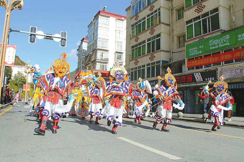 壤塘藏戲走上街頭表演,讓群眾在家門口感受非遺文化。易西 攝