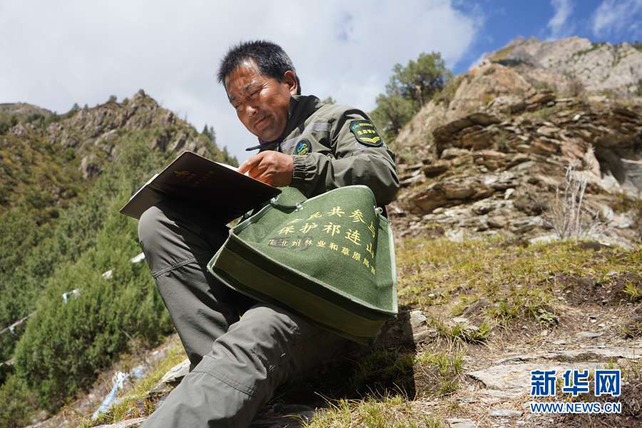 祁連山國家公園青海片區(qū)油葫蘆管護(hù)站的生態(tài)管護(hù)員王學(xué)清在記錄巡山情況(9月9日攝)。新華社記者 藍(lán)翔 攝