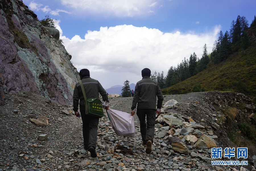 祁連山國家公園青海片區(qū)油葫蘆管護(hù)站的生態(tài)管護(hù)員在撿拾垃圾(9月9日攝)。新華社記者 藍(lán)翔 攝
