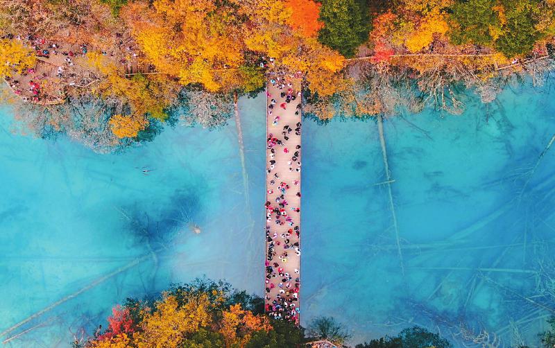 深秋的九寨溝景區(qū),五花海景點(diǎn)引來游客觀賞彩林、海子。 蘇楊 攝