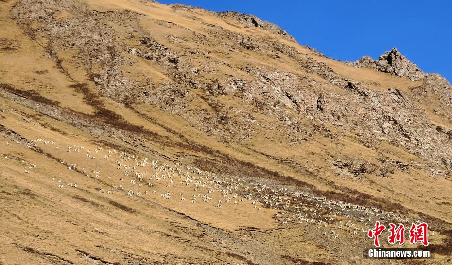 位于青海省南部的三江源區(qū)域,包括長江源(可可西里)、黃河源、瀾滄江源,是青藏高原生態(tài)系統(tǒng)的典型代表,分布雪豹、藏羚羊、野牦牛、黑頸鶴等珍稀物種,被稱“高原野生動物王國”、“高寒生物種質(zhì)資源庫”。圖為巖羊群。曲麻萊管理處 供圖