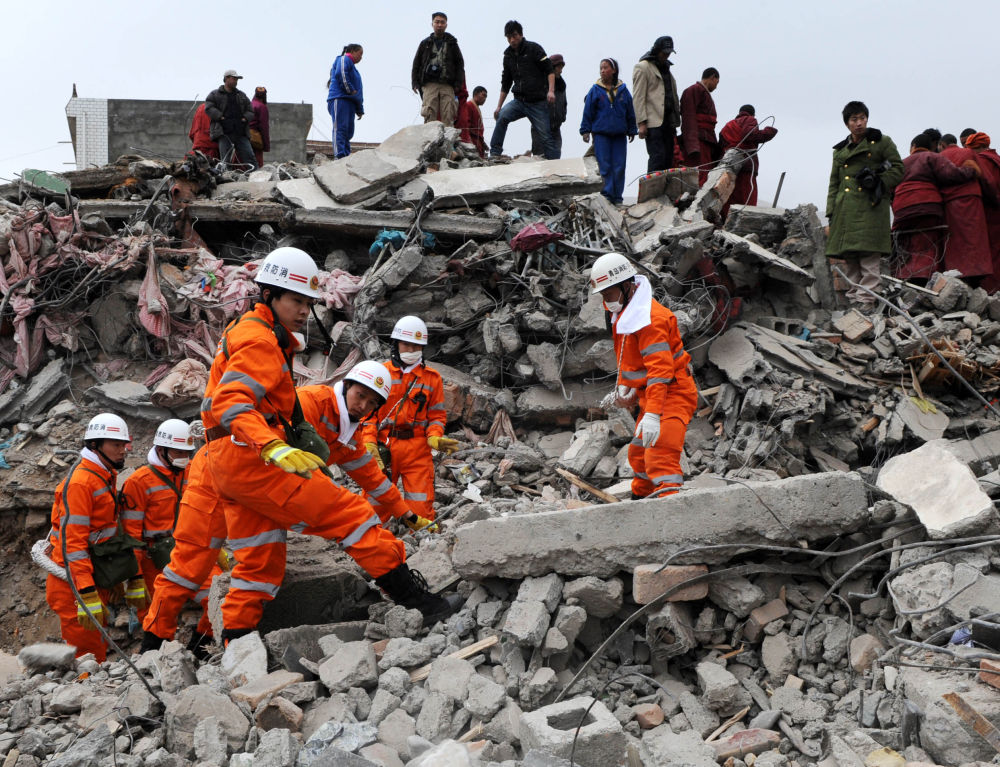 圖為2010年4月16日,救援人員在結(jié)古寺賓館進行救援。